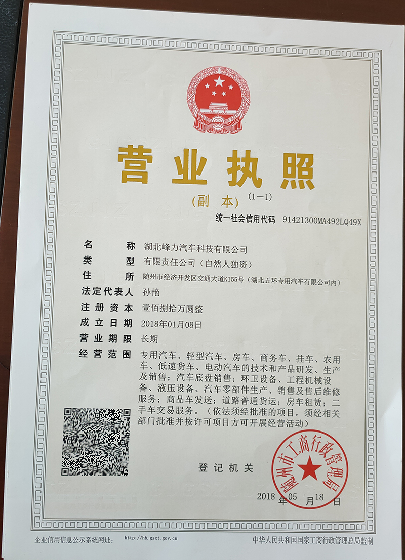 湖北峰力汽車科技有限公司注冊地址位于隨州市經濟開發(fā)區(qū)**大道K155號(湖北五環(huán)專用汽車有限公司內),注冊機關為隨州市市場監(jiān)督管理局,法人代表為孫艷,經營范圍包括專用汽車、輕型汽車、房車、商務車、掛車、農用車、低速貨車、電動汽車的技術和產品研發(fā)、生產及銷售;汽車底盤銷售;環(huán)衛(wèi)設備、工程機械設備、液壓設備、汽車零部件生產、銷售及售后維修服務;商品車發(fā)送。