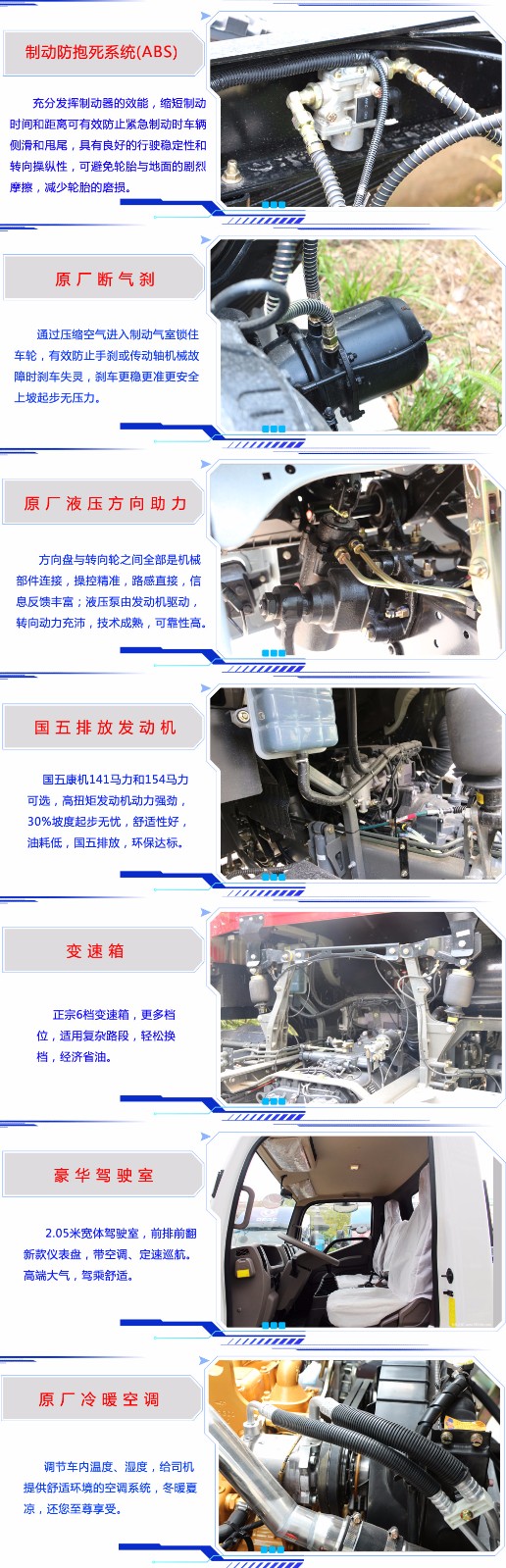 底盤配置:該車才用福田康明斯154馬力發(fā)動(dòng)機(jī)(歐五排放標(biāo)準(zhǔn)帶尿素罐),6檔手動(dòng)變速箱,3800mm軸距,7.50R16鋼絲胎,氣剎,帶冷熱空調(diào),帶離合器助力,帶方向助力,帶定速巡航功能,2.05米寬體駕駛室??傎|(zhì)量:7噸,車身自重4.8噸。